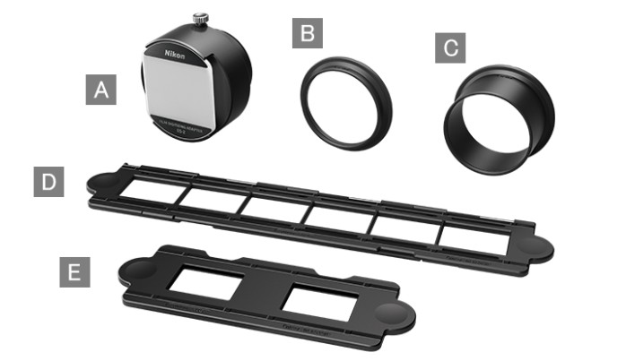 相比上一代產品ES-2重要改進增加了膠片夾具。ES-2一共由5個部件組成,下圖中A是ES-2的核心部件,它負責連接鏡頭與膠片,可直接安裝APS-C畫幅的AF-S DX Micro NIKKOR 40mm f/2.8G鏡頭,帶有一枚螺絲來控制松緊度。假若要連接AF-S Micro NIKKOR 60mm f/2.8G ED或AI AF Micro-Nikkor 60mm f/2.8D鏡頭,需要使用B或C的62mm轉接環(huán)。與此同時ES-2搭配了帶狀膠片夾FH-4、滑動支架FH-5兩種不同的膠片夾具,FH-4、FH-5可調整俯仰、旋轉角度,壓平、傳輸膠片變得非常方便。